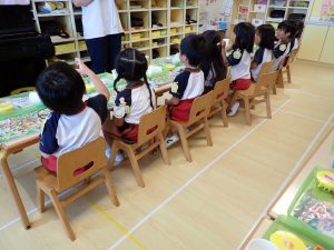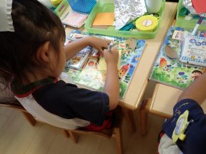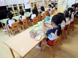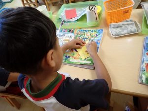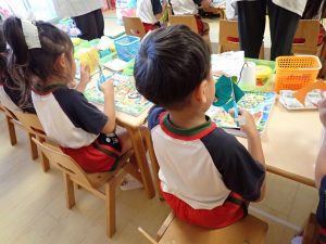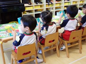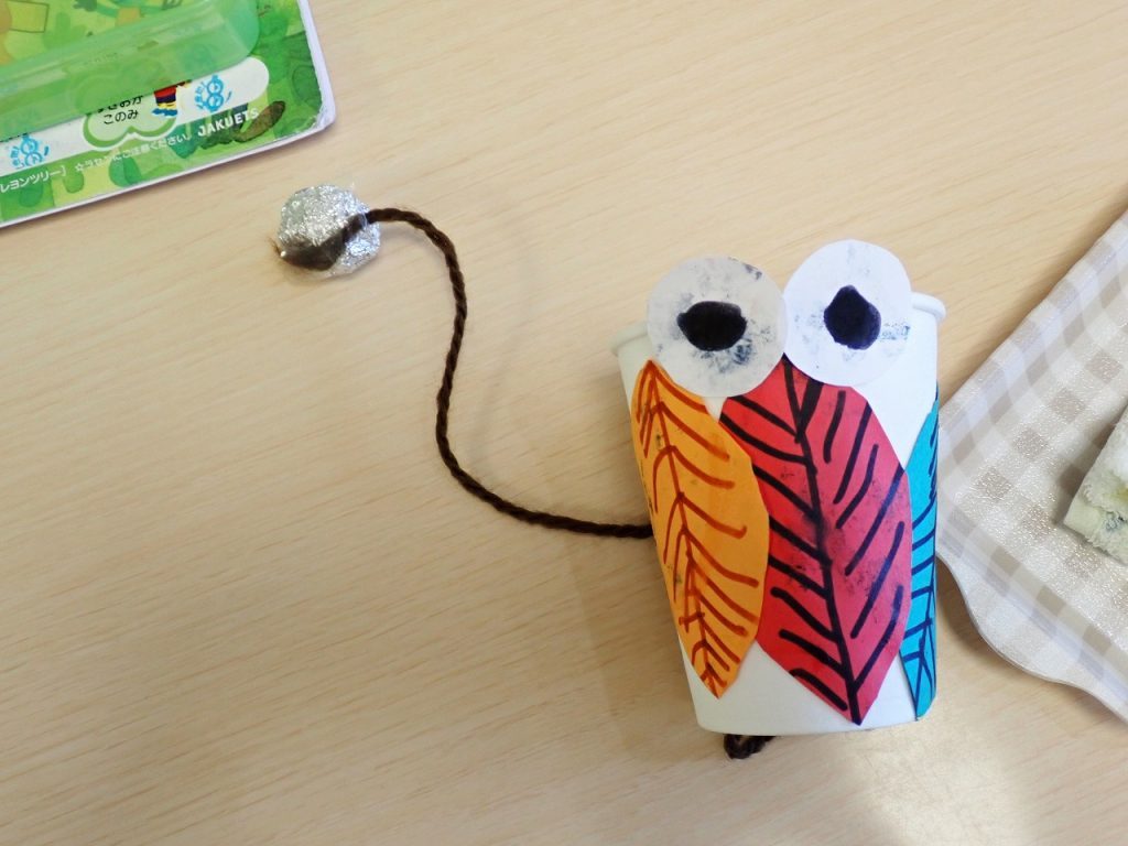 9月22日(月)みのむしけん玉作り(4歳児:きぎく組) 2025年9月22日 教育実習生の実習がありました。「みのむしけん玉」を作りました。実際の葉を見ながら画用紙に葉を描きました。目玉も作ってはさみで切り、紙コップにのりではりました。アルミホイルを丸めてけん玉にしました。素敵な「みのむしけん玉」ができあがりました。「保護者専用ページ」に子どもたちの活動の様子をアップしました。 前の記事 一覧へもどる 次の記事
