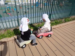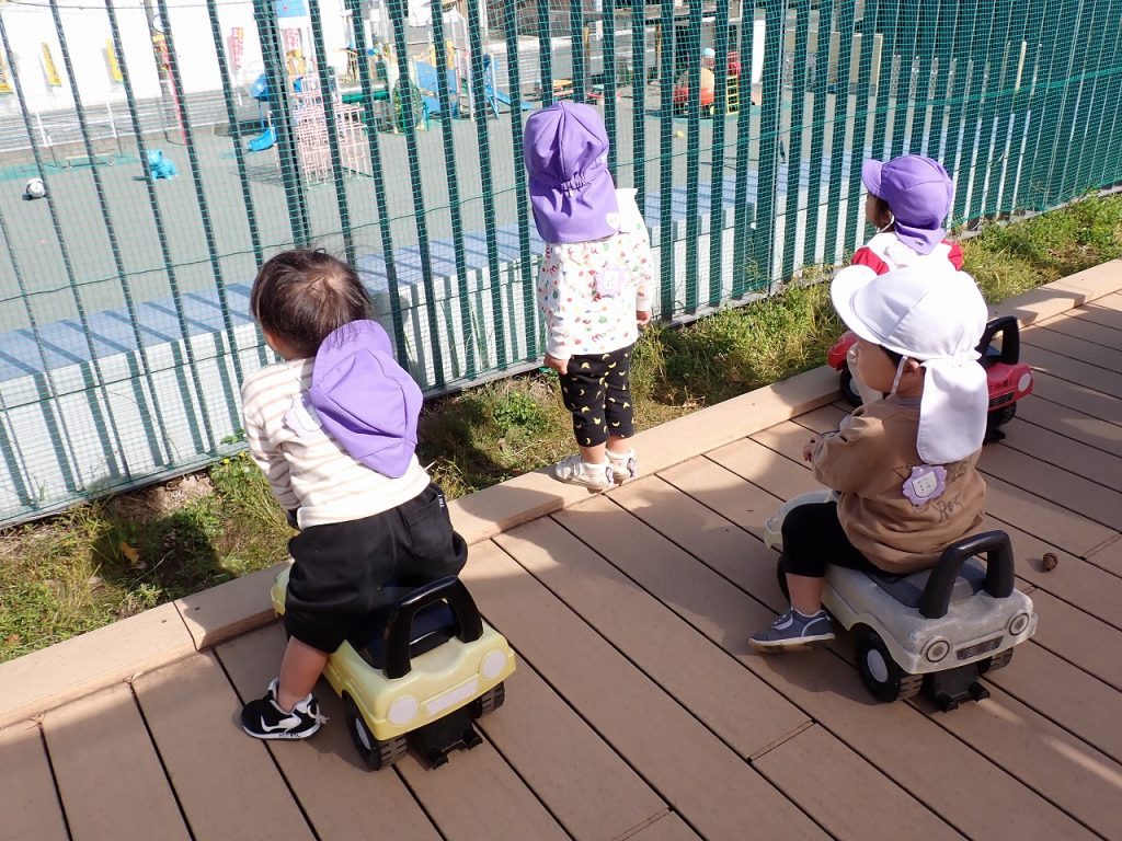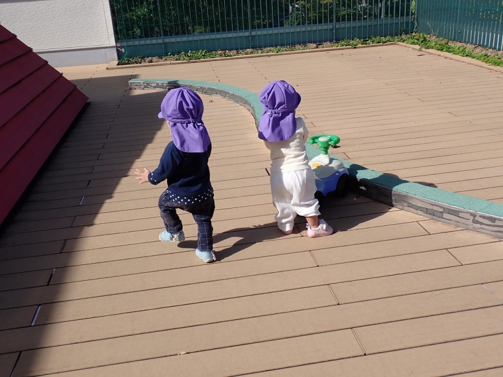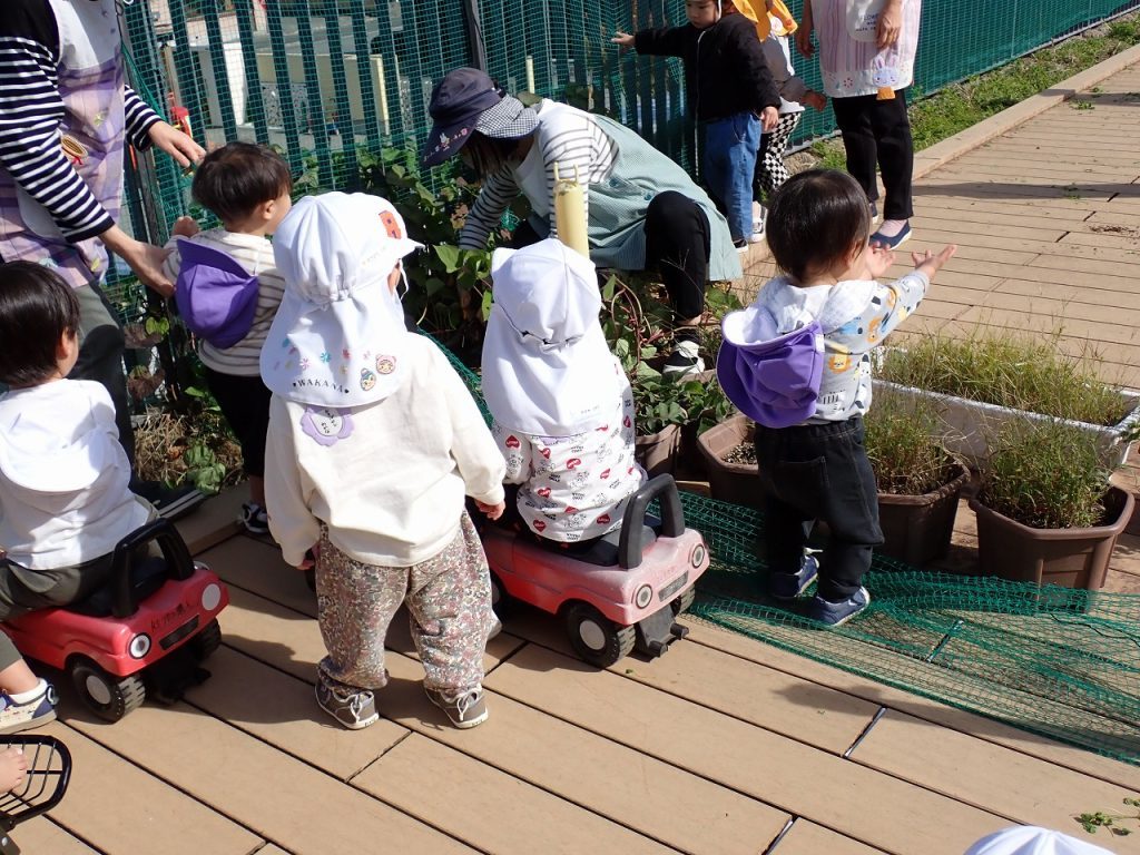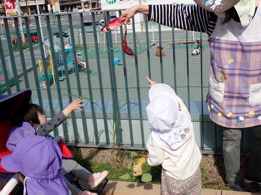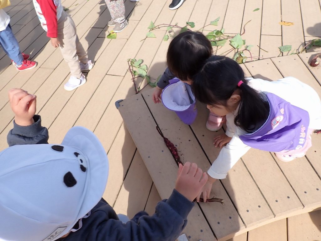11月4日(火)テラス遊び【0歳・1歳】 2025年11月4日 つぼみ・すみれさん(0歳1歳)がテラスで楽しく遊んでいました。テラスの土の部分に植えてあったいもを掘りました。狭い場所ですが、大きないもがとれました。掘ったいもを不思議そうに見ている人やいもをさわって楽しんでいる人もいました。また、いもの長いつるで遊んでいる人もいました。「保護者専用ページ」に子どもたちの様子をアップしました。 前の記事 一覧へもどる