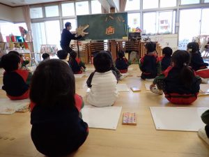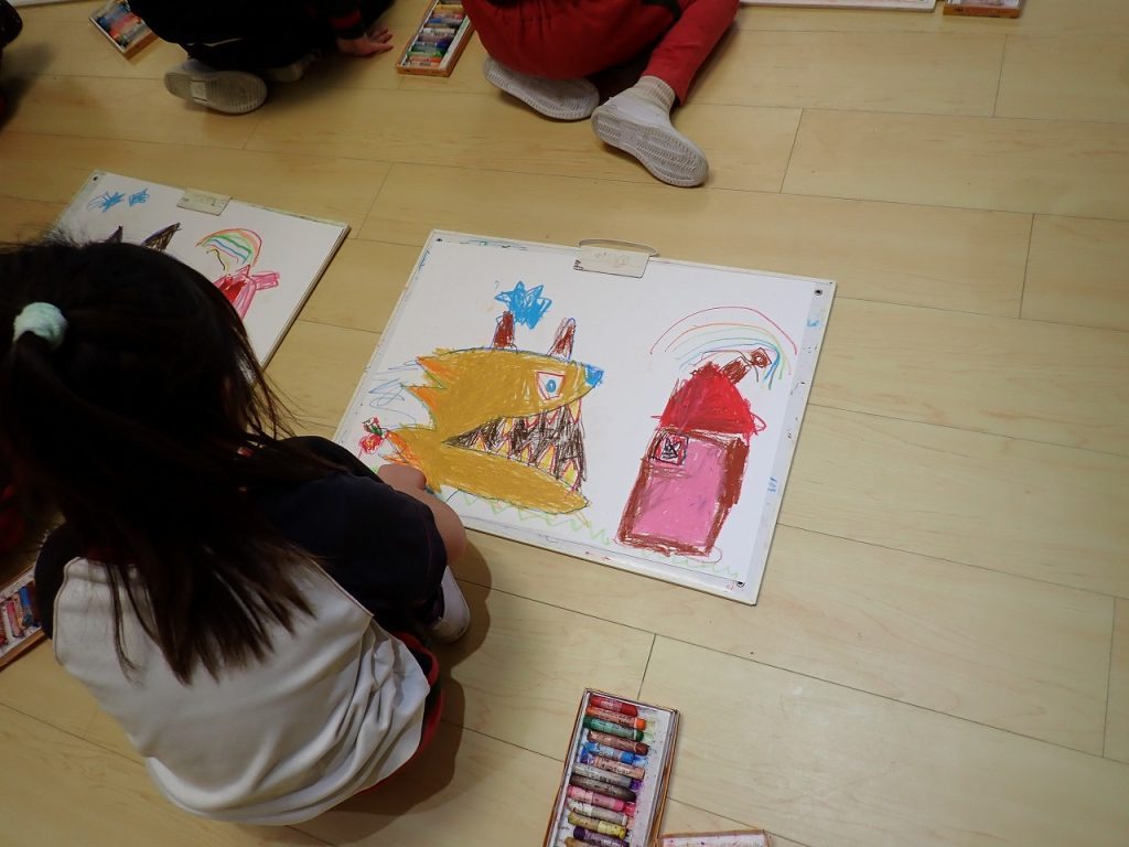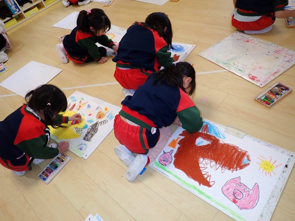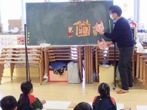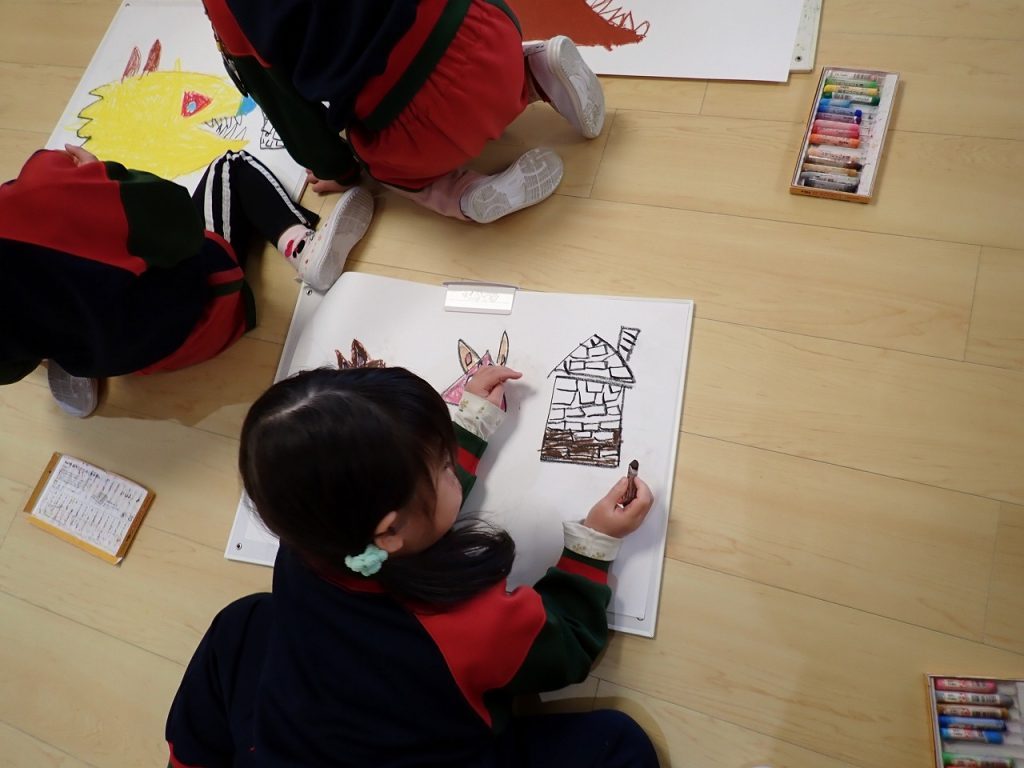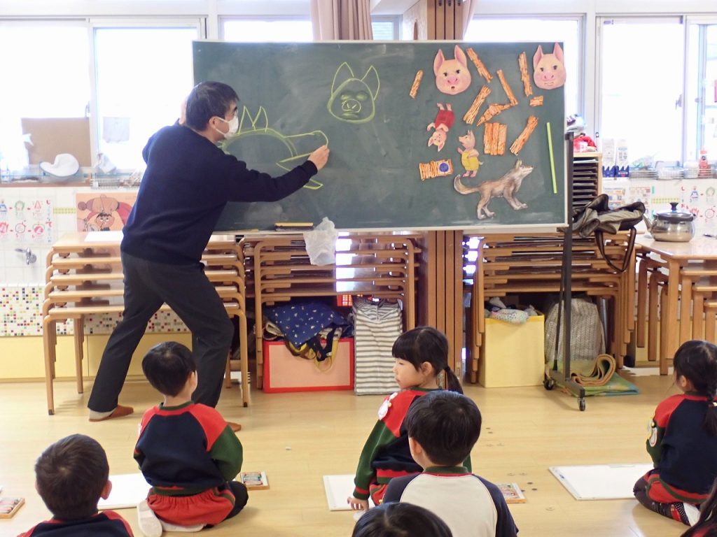 1月27日(火)絵画教室≪年中組≫ 2026年1月27日 外部講師田中正文先生による絵画教室が行われました。今回のテーマは、「お話の絵~三びきのこぶた~」でした。先生自作の大きなおおかみやこぶた、木の家を使ってお話をしてくれました。子どもたちは、お話の世界に引き込まれ、その流れでとても楽しそうに絵を描いていました。「保護者専用ページ」に年中さんの様子をアップしました。 前の記事 一覧へもどる 次の記事