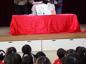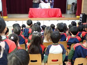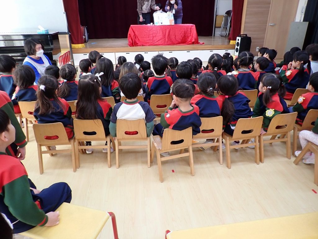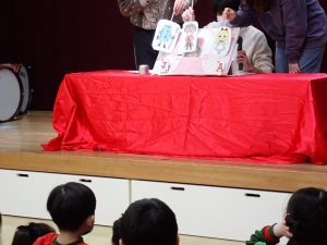 1月29日(木)皇学館大学生による手遊び・ペープサート 2026年1月29日 皇学館大学の学生さん3人が、卒業記念ミュージカルの広報のためこども園に来てくれました。年少年中年長さんが手遊びを楽しんだ後、ペープサートを見せていただきました。「保護者専用ページ」に子どもたちの様子をアップしました。 前の記事 一覧へもどる 次の記事