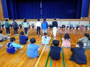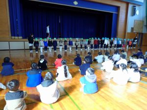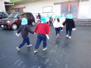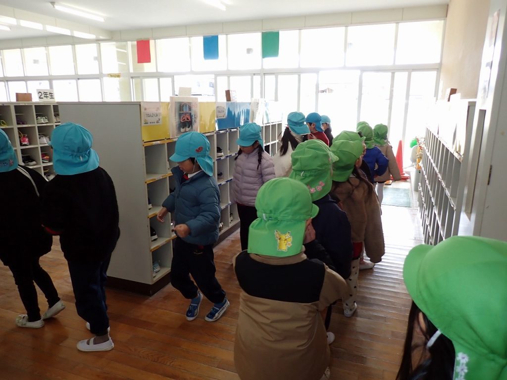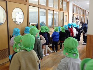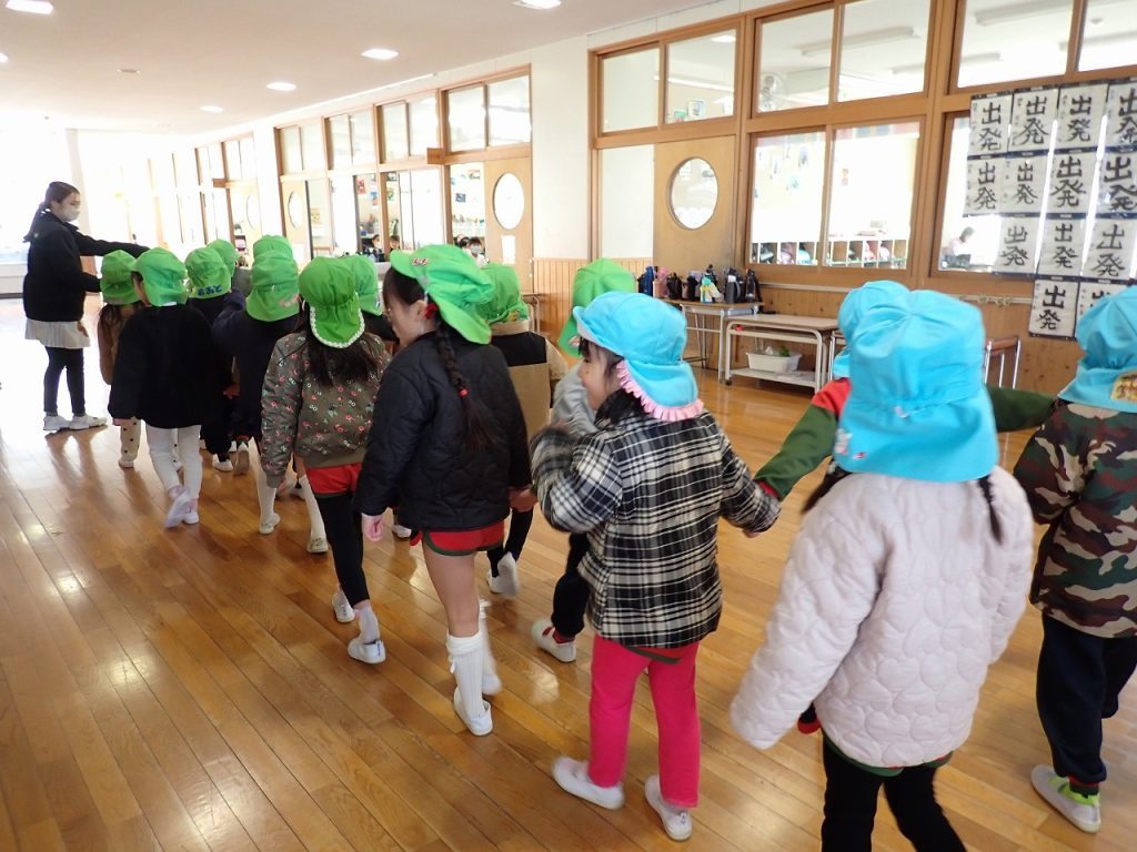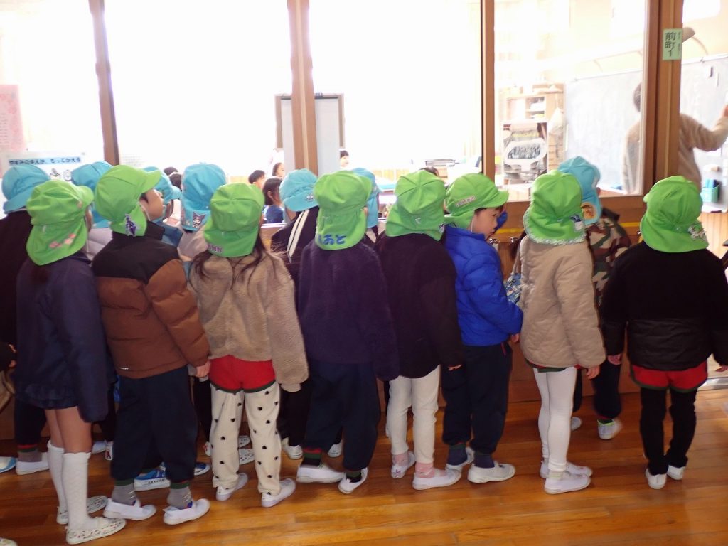 年長さんが、有緝小学校見学に行かせてもらいました。体育館では、1年生の皆さんの元気な歌声を聞かせてもらいました。その後、じゃんけん列車をして楽しみました。校舎の見学もさせていただきました。小学校を知ることで、スムーズに小学校生活に入っていってくれることを願っています。最後にげた箱を案内していただき教頭先生から「1年生になったらここにくつを入れてください。みなさんが来てくれるのを楽しみにしています。他の小学校へ行く人も頑張ってください」とお話していただきました。「保護者専用ページ」に子どもたちの様子をアップしました。