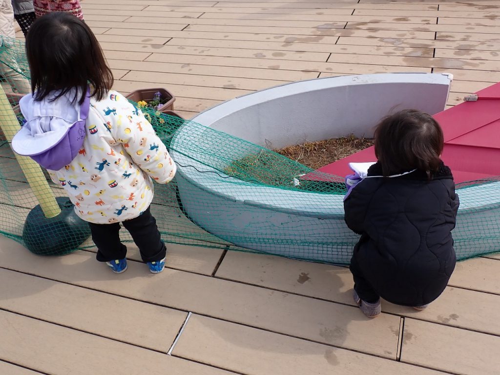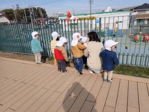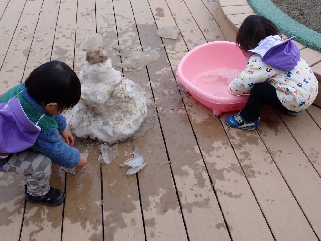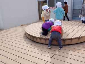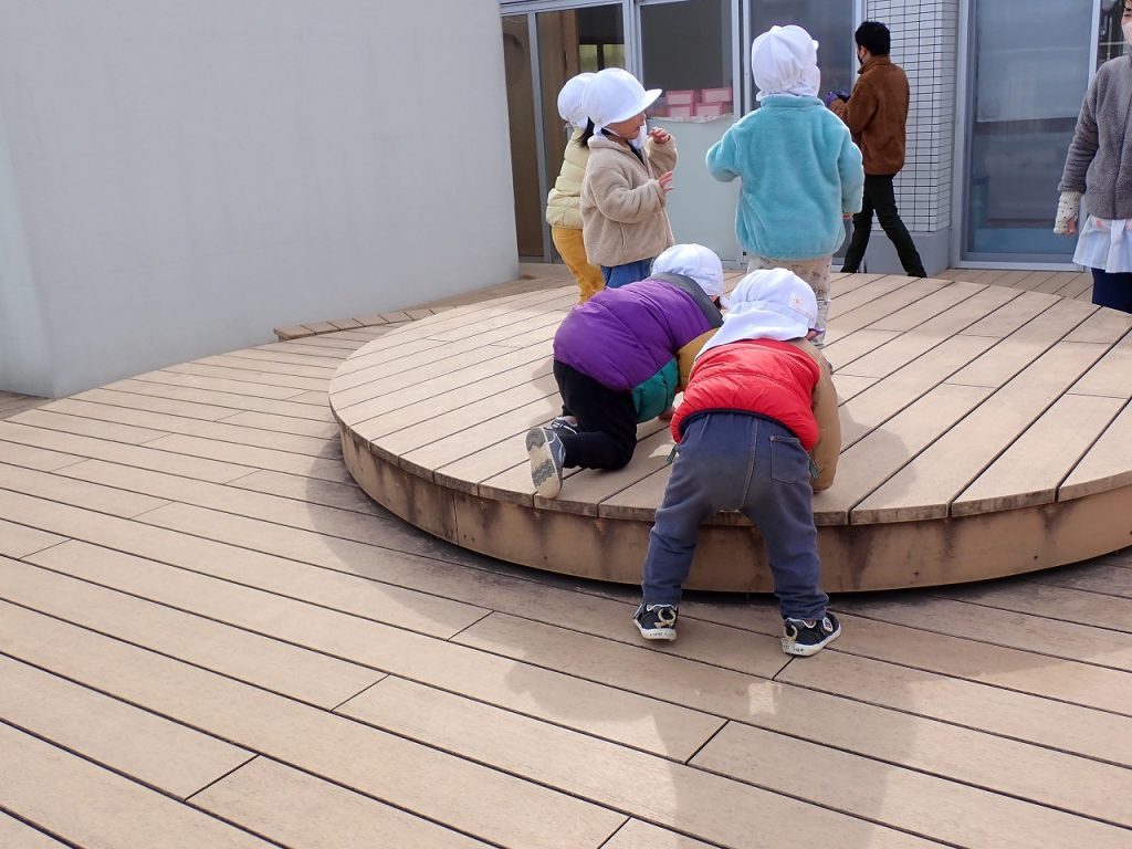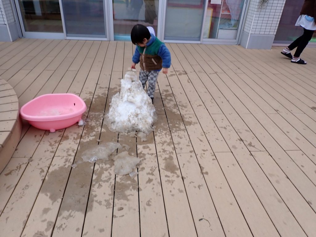 2月10日(火)テラス遊び≪0・1歳児≫ 2026年2月10日 あたたかい陽ざしの中で0歳児1歳児さんがテラス遊びを楽しんでいました。すみれ白組さんは、2歳児さんが遊ぶテラスのエリアで遊んでいました。段差のある大きな円の台にのってジャンプをしていました。2階の広いテラスで走り回っている人もいました。つぼみ・すみれ紫組さんは、昨日作った雪だるまが残っていて、固まった雪や氷をさわって喜んでいる人もいました。「保護者専用ページ」に子どもたちの様子をアップしました。 前の記事 一覧へもどる