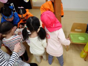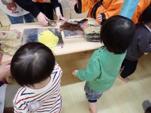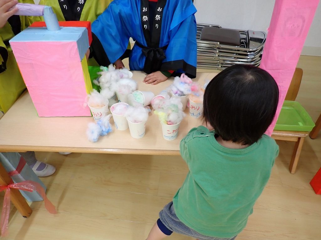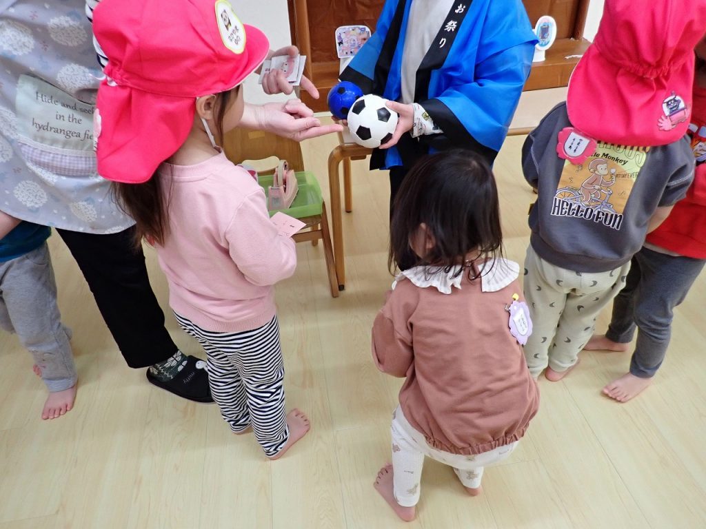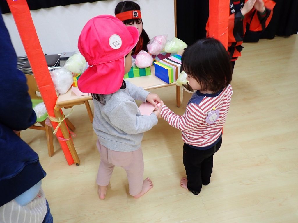 3月9日(月)おまつりごっこ 2026年3月9日 年中さんがおまつりごっこをして園のみんなを招待してくれています。0歳児(つぼみ組)と1歳児(すみれ紫組)がうめ組(2歳児)とペアになりいろいろな屋台をまわっていました。うめ組さんが小さなお友だちと手をつないでまわっている様子は、たのもしく思えました。「保護者専用ページ」につぼみ・すみれ紫さんの様子をアップしました。 前の記事 一覧へもどる