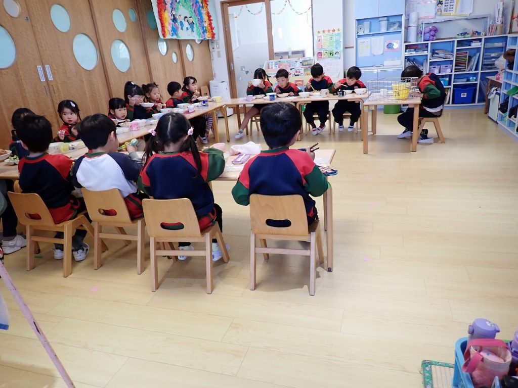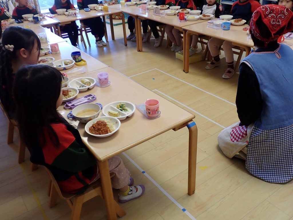 3月10日(火)みんなで給食(年長・年中・年少) 2026年3月10日 年長・年中・年少さんが、いっしょに給食を食べました。いつもとは違い異年齢での給食になりました。年上の子どもが年下の子どもにやさしく声を掛けている場面もありました。いつもよりよく食べている人がたくさんいました。みんなで食べるとおいしいようでした。「保護者専用ページ」に子どもたちの様子をアップしました。 前の記事 一覧へもどる